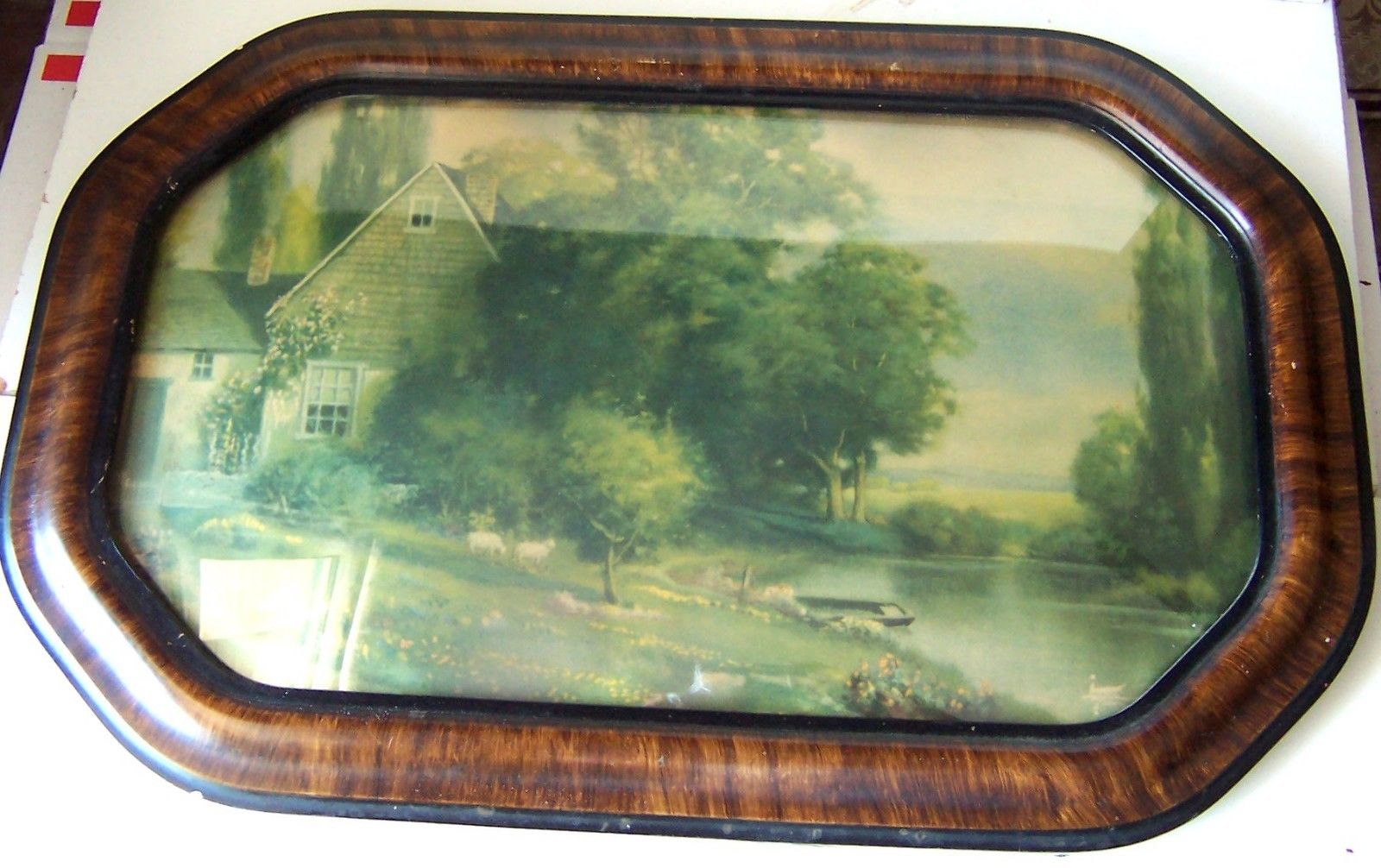 Title (ebay affiliate link): Vintage Wood Gesso Frame w/Curved Glass Print Summer Scene House, Lake, Trees