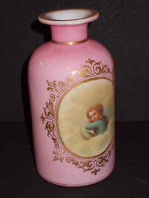 Antique Victorian Cased Glass Cologne Bottle Enamel Art Boy with Globe In Clouds