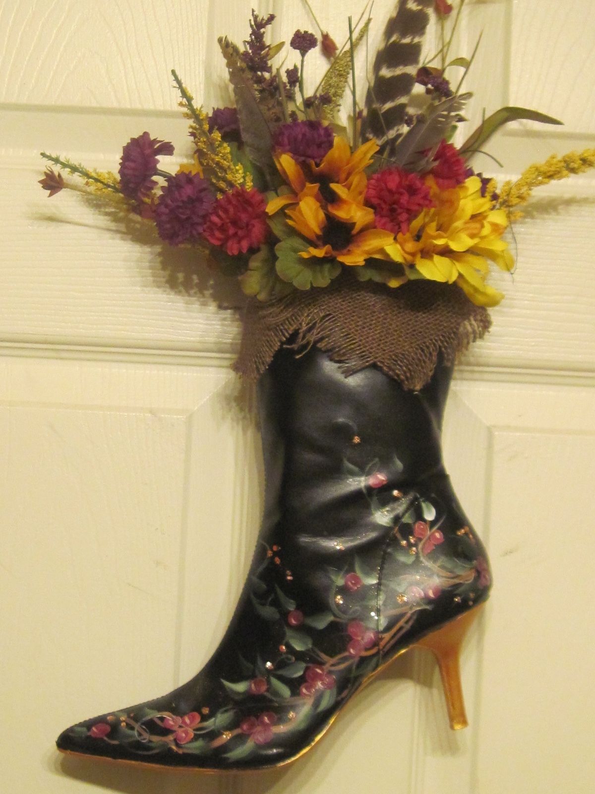 Title (ebay affiliate link): HAND PAINTED CRAFTED FALL HALLOWEEN BOOT FLORAL DOOR WALL ARRANGEMENT