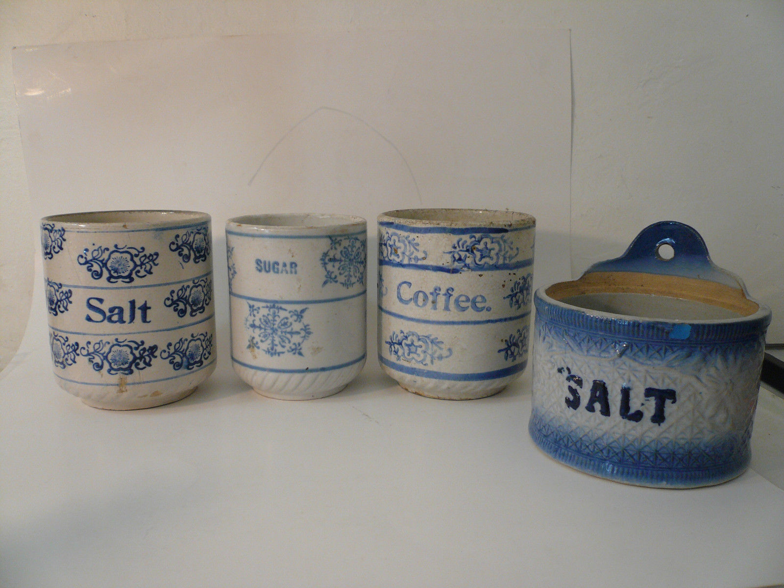4 Primitive Antique Coffee Sugar Salt Box Stoneware Pottery Crocks