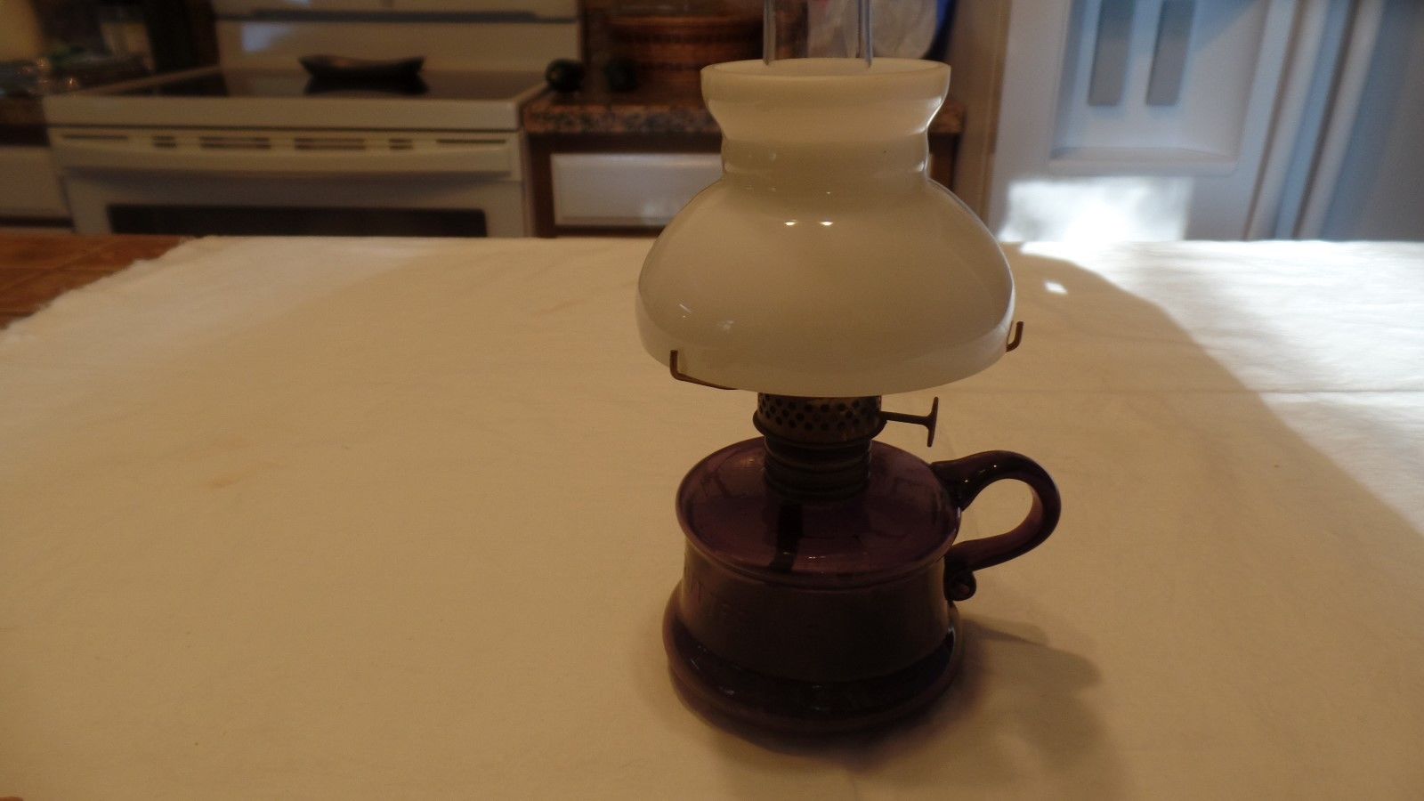 Title (ebay affiliate link): LITTLE BUTTERCUP Amethyst Glass Finger Lamp, Original Chimney & Milk Glass Shade
