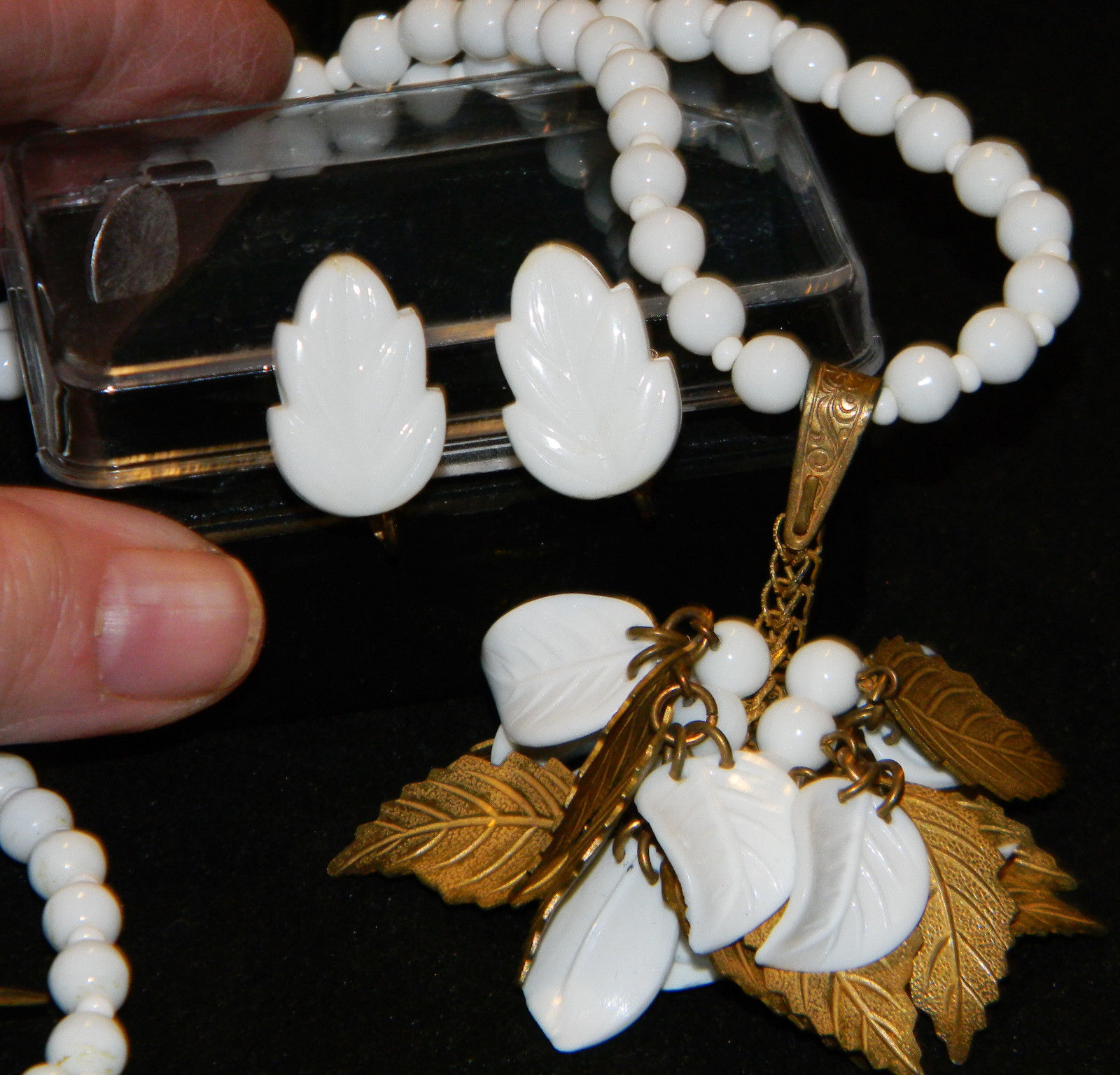 Title (ebay affiliate link): ALL SIGNED MIRIAM HASKELL WHITE MILKGLASS GOLD LEAF VTG.LOT CLUSTER NECKLACE ER