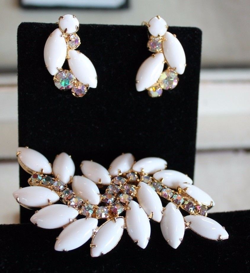 Title (ebay affiliate link): Vintage JULIANA Demi Parure Milk Glass AB Rhinestone LongPin Brooch Clip Earring