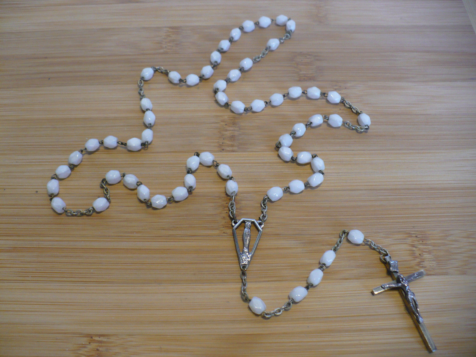 Title (ebay affiliate link): VINTAGE WHITE MILK GLASS "OUR LADY OF GRACE" CATHOLIC ROSARY