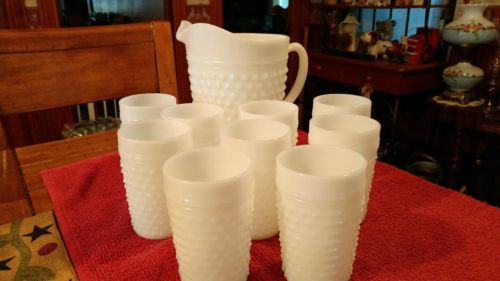Vintage Hobnail Milk Glass Pitcher with 9 Glasses