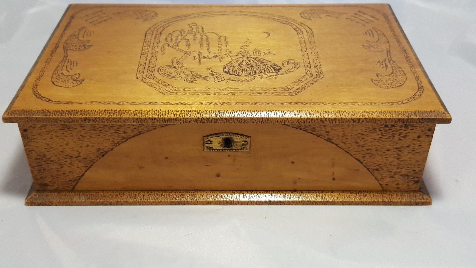 Title (ebay affiliate link): Australian Pokerwork Sewing Box Decorated with Crinoline Lady In Garden C1930s