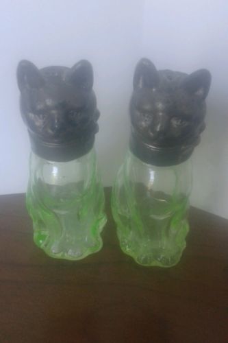 Title (ebay affiliate link): RARE ANTIQUE GREEN DEPRESSION GLASS CAT SALT AND PEPPER SHAKERS 1 DAMAGED AS IS
