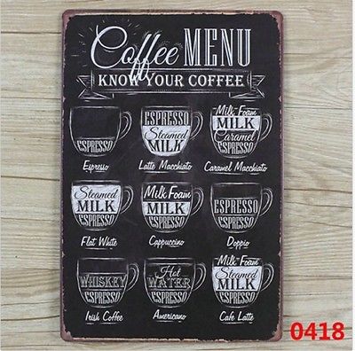 Title (ebay affiliate link): Coffee Menu Vintage Tin Sign Bar Pub Shop Home Wall Decor Retro Metal20*30CM