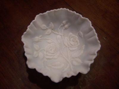 WHITE BOWL WITH RAISED ROSES FLOWERS--MILK GLASS?
