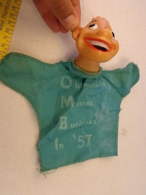 Title (ebay affiliate link): 1957 Oldsmobile Means Business Puppet Advertising, Cloth w/ Rubber head, Scarce