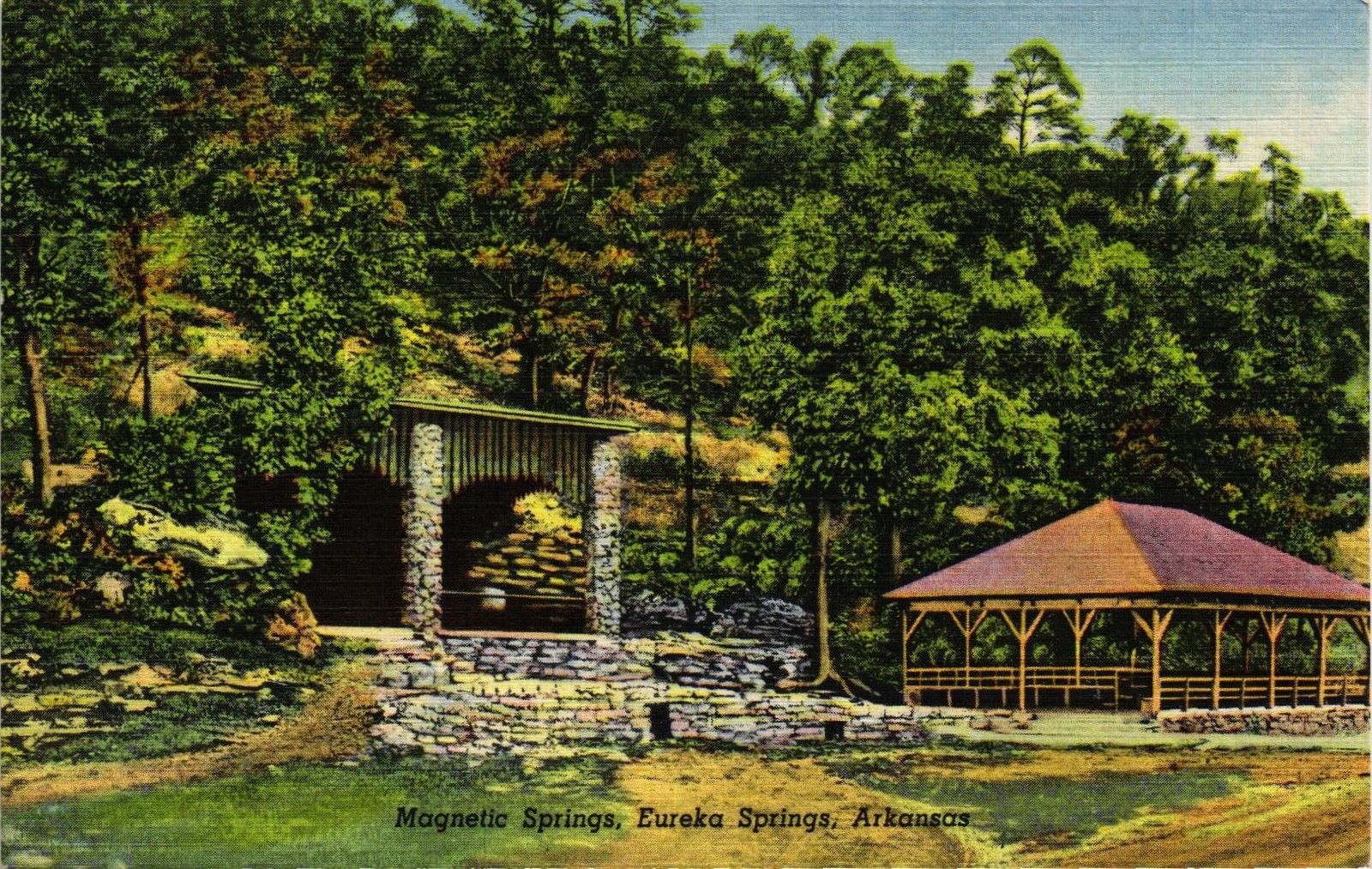 DR JIM STAMPS US MAGNETIC SPRINGS EUREKA SPRINGS ARKANSAS LINEN POSTCARD 1956