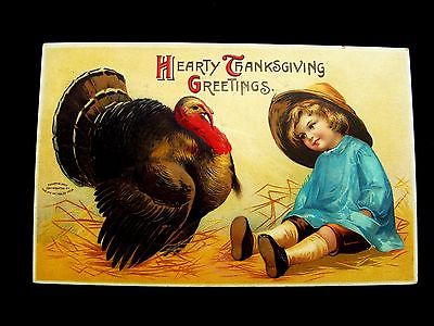 Sweet Girl w Blue Smock Straw Hat w Nice Turkey Clapsaddle Thanksgiving Postcard