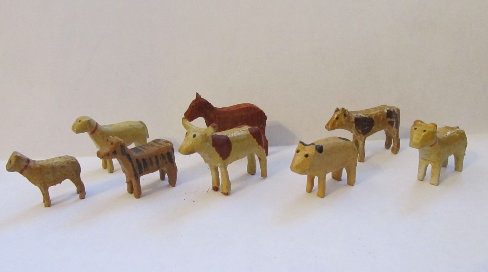 VINTAGE GERMAN CARVED WOODEN MINIATURE FARM ANIMALS PUTZ village LOT OF 8