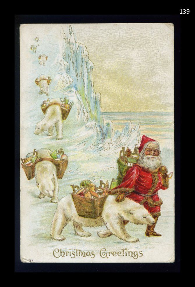 Title (ebay affiliate link): 1910s Santa Leads Polar Bears Packing Toys Down North Pole Mtn.Christmas PC #138