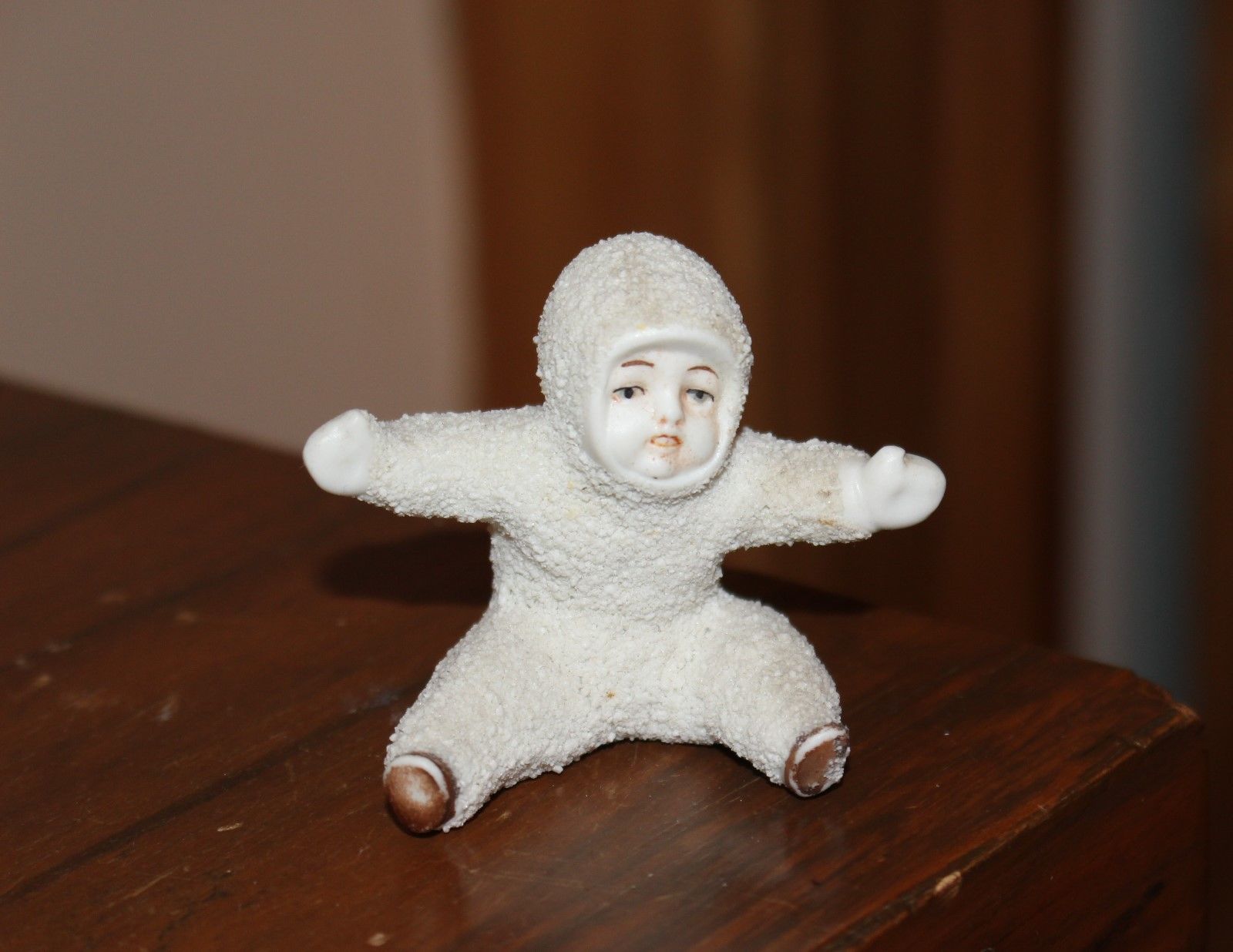 Title (ebay affiliate link): Miniature Seated Snow Baby. Great Face. German. Early 1900s. Peg hole in bottom