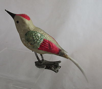 Antique Blown Glass Christmas Tree Ornament Bird w/Red&Green Wings Clip On