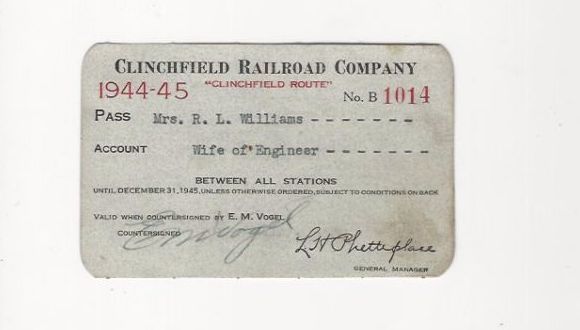 Title (ebay affiliate link): 1944 - 45 CLINCHFIELD RAILROAD COMPANY PASS TRAIN DEPOT STATION RR RY VERY NICE