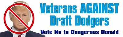 Title (ebay affiliate link): Anti-Trump Bumper Sticker 3" X 10" Veteran Against Draft Dodger Dangerous Donald