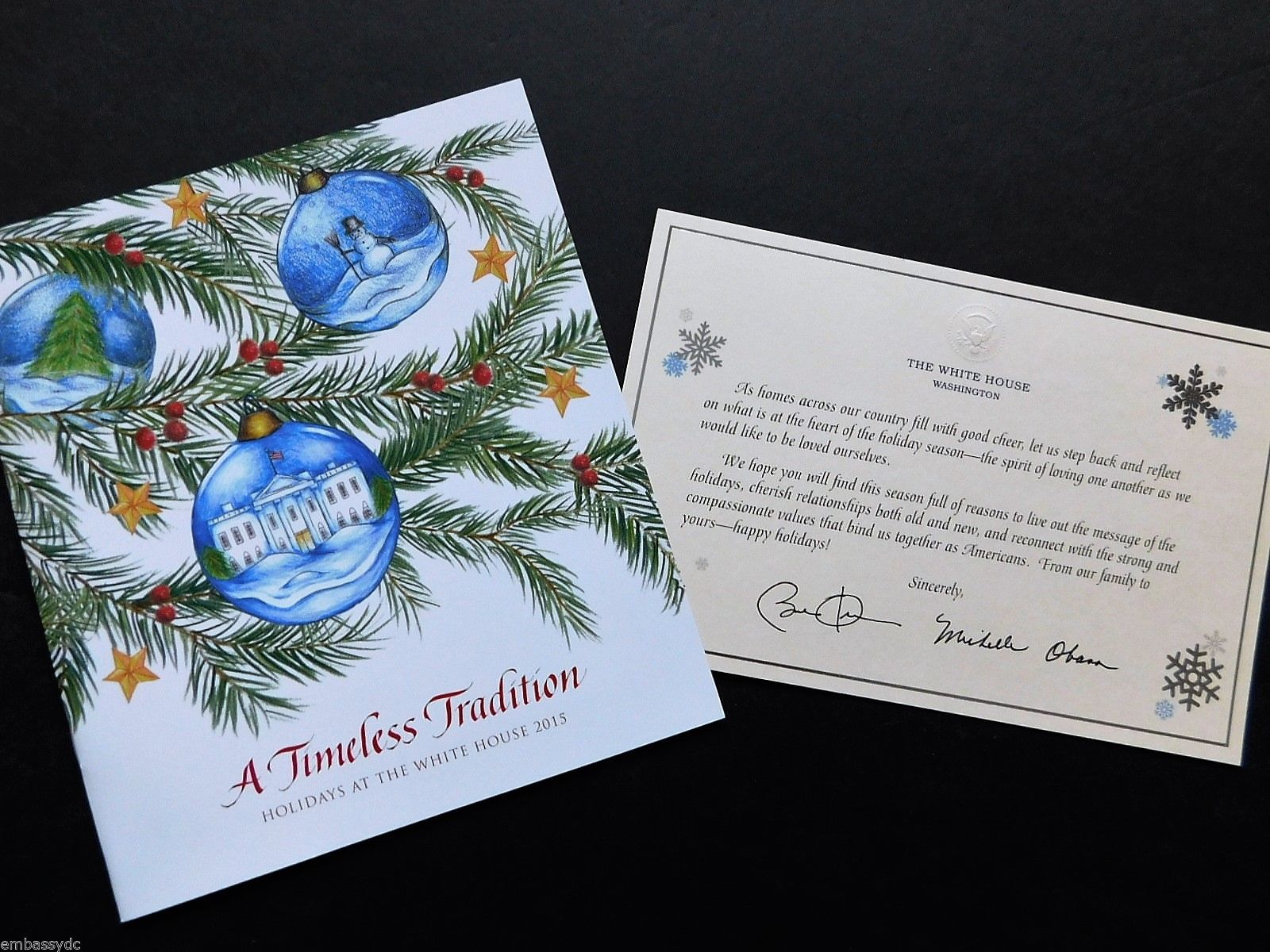 Title (ebay affiliate link): OBAMA Holiday CHRISTMAS SNOWFLAKE White House GREETING card + 2015 tour BOOKLET
