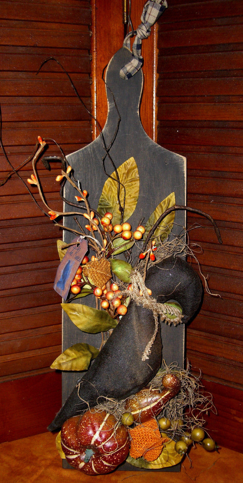 PRIMITIVE FALL HALLOWEEN DECOR, VTG BREADBOARD, CROW, GOURDS, BURLAP