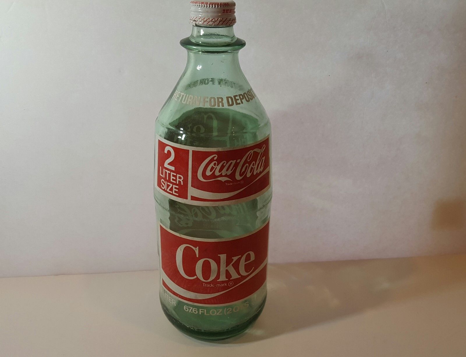 Title (ebay affiliate link): 1970's COCA-COLA 2 LITER 67.6 OZ (2QTS 3.6 OZS) GREEN GLASS BOTTLE WITH CAP