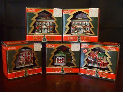 Vintage Coca Cola Christmas Holiday Village Ornaments Coke Soda Set of 5
