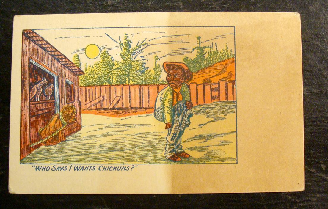 Title (ebay affiliate link): 1910 BLACK AMERICANA POSTCARD-"WHO SAYS I WANTS CHICKUNS?"