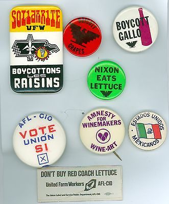 7 Vintage 1960-80's UFW Pinback Buttons & 1 Don't Buy Red Coach Lettuce Sticker