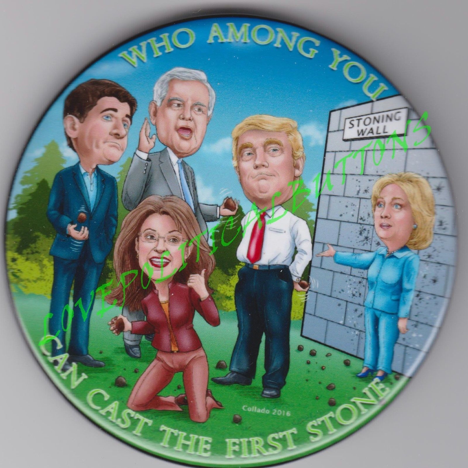 Title (ebay affiliate link): HILLARY CLINTON 2016 "CAST THE FIRST STONE" w DONALD TRUMP BUTTON PINBACK PIN