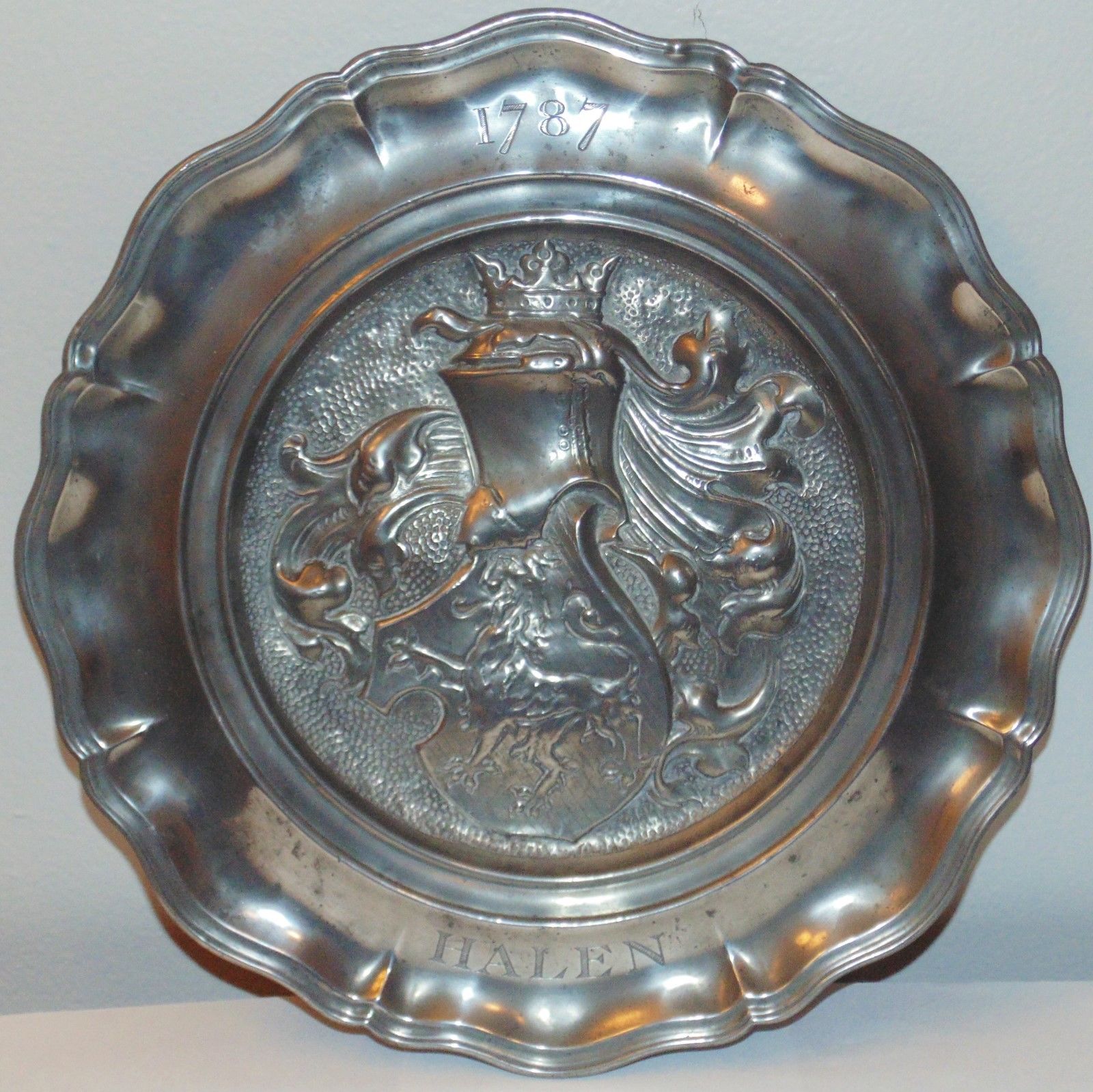 ANTIQUE 1787 PEWTER COAT OF ARMS CHARGER WALL PLAQUE HALEN KNIGHT & LION DRAGON