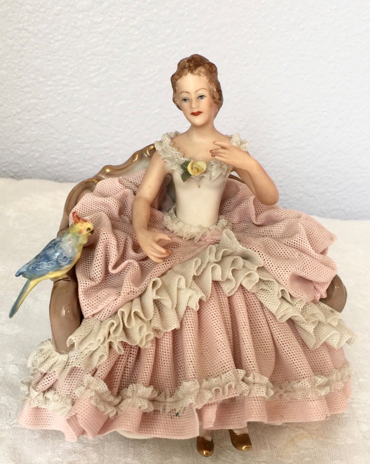 Title (ebay affiliate link): Antique Dresden Pink Lace Lady Settee Porcelain Parrot Figurine Germany
