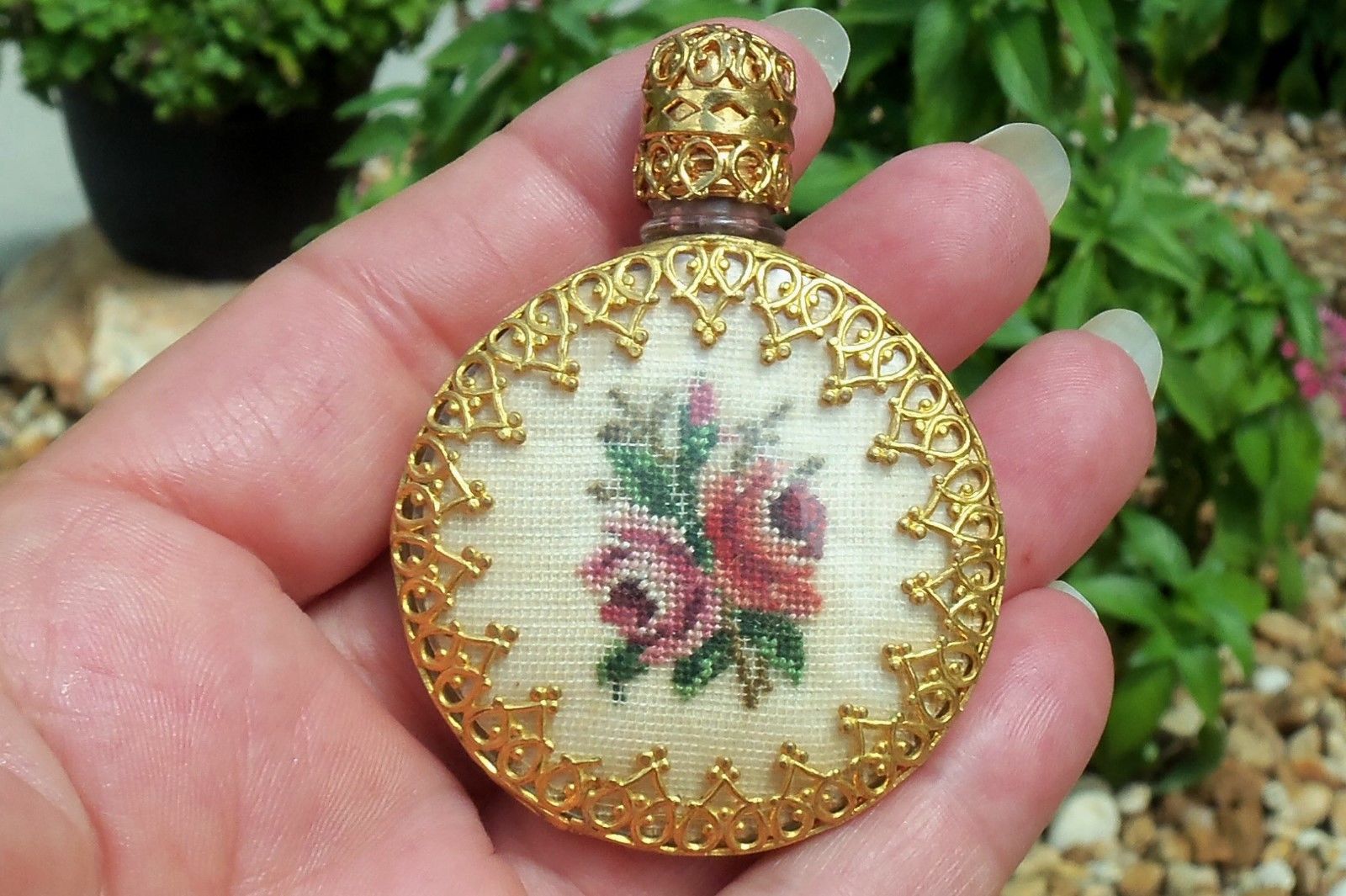 Title (ebay affiliate link): Vint ORNATE Goldtone FILIGREE Sm GLASS Perfume BOTTLE w/ NEEDLEPOINT Rose CENTER