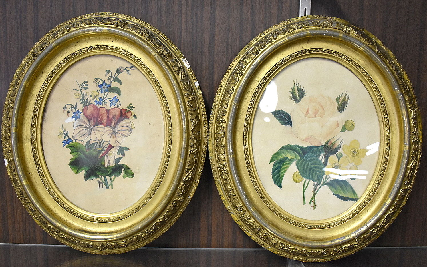 Pair of Victorian 19thC Gold Gilt Oval Picture Frames & Floral Watercolors