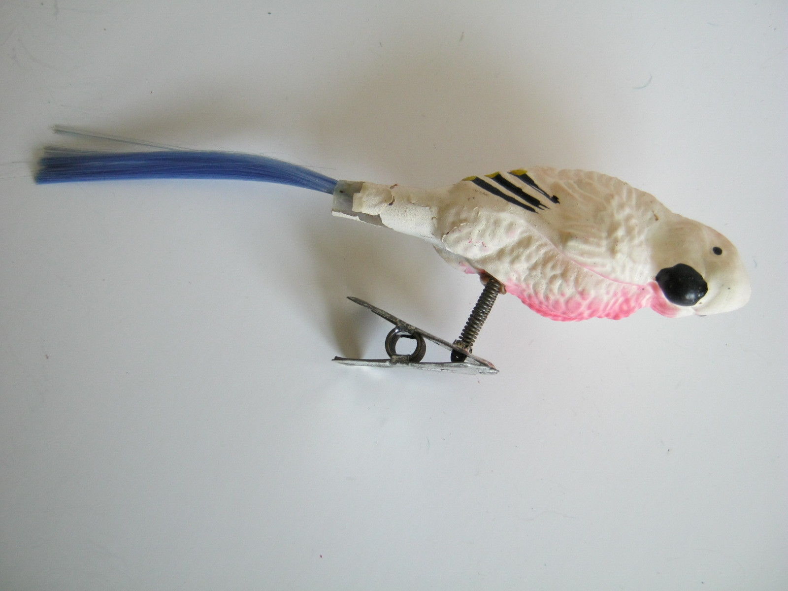 Title (ebay affiliate link): ANTIQUE CHRISTMAS ORNAMENT, CLIP-ON PARAKEET WITH BLUE SPUN GLASS TAIL