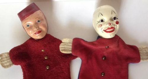 Title (ebay affiliate link): 2 Antique 1920's Hand Puppets Composition Cloth Dolls Clown Bellhop Vintage