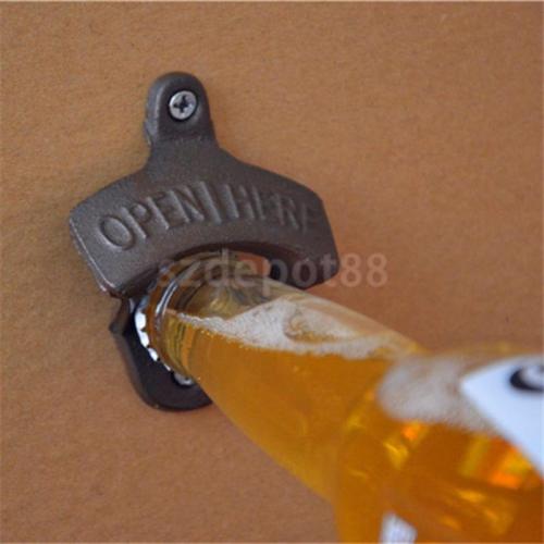 Title (ebay affiliate link): OPEN HERE Wall Mounted Bottle Top Opener Man Cave Bar Rustic Style Cast Iron