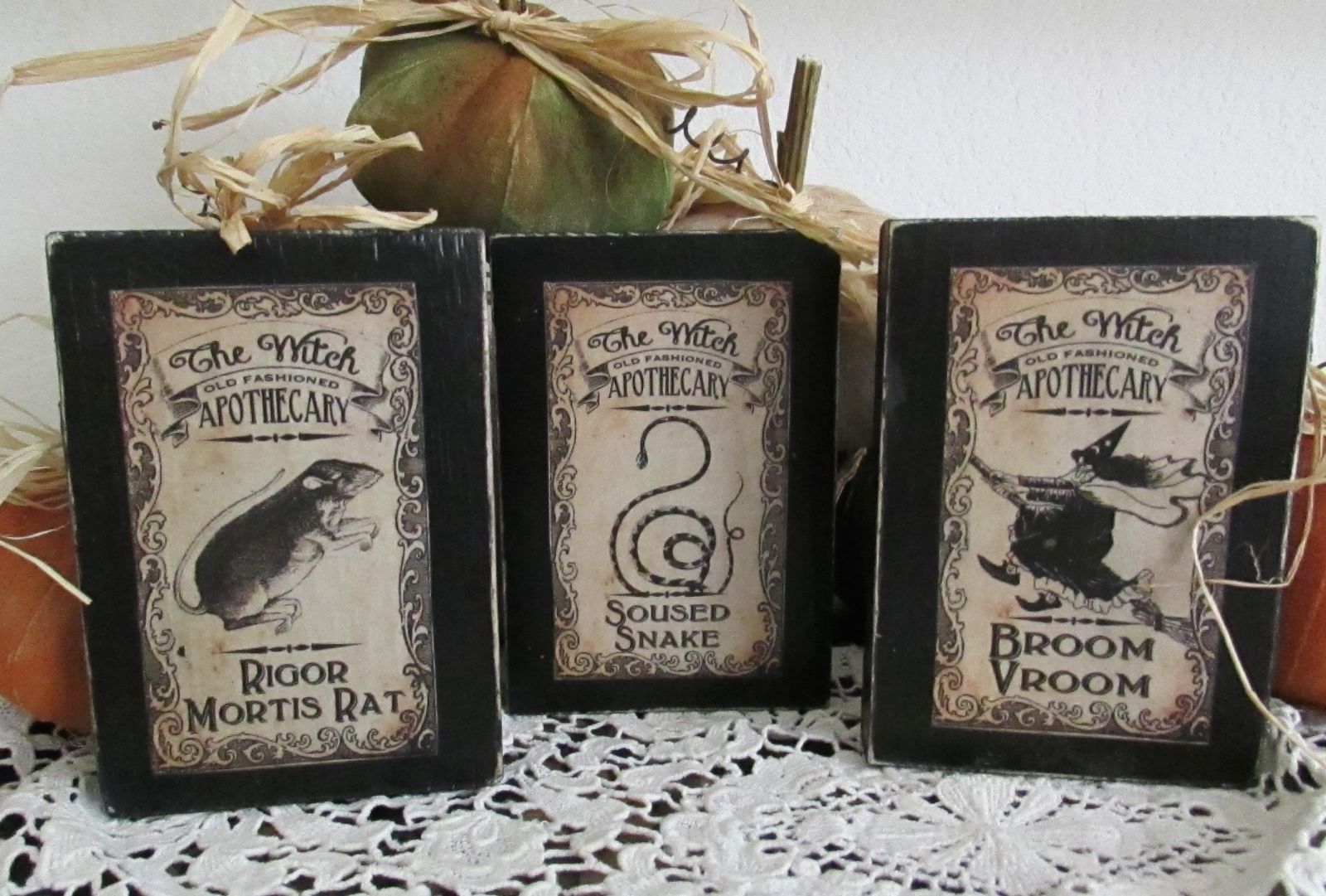 Title (ebay affiliate link): 3 Halloween Vintage Look Apothecary Wood Block Shelf Sitters Rat Snake Witch