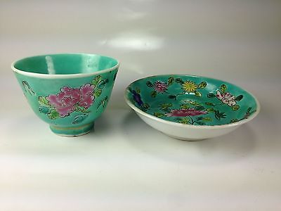 ANTIQUE CHINESE SIGNED TEA CUP AND SAUCER LOVELY AQUA GREEN WITH FLOWERS