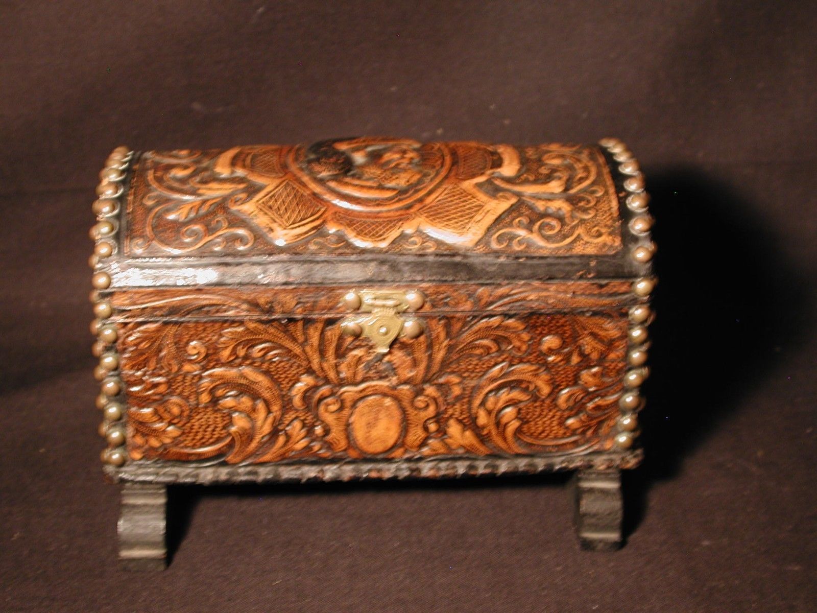 Title (ebay affiliate link): Fabulous Antique Tooled Leather Casket Style Document Jewelry Box Brass Beading