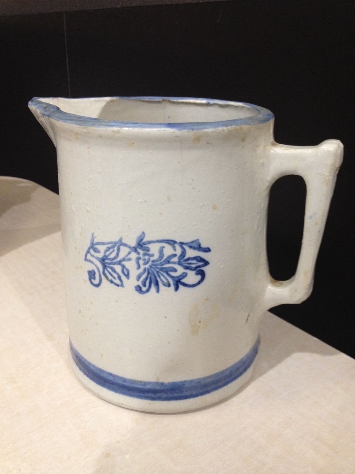 Title (ebay affiliate link): Antique Blue White Stoneware 7" High Pitcher Floral Designs on sides OLD