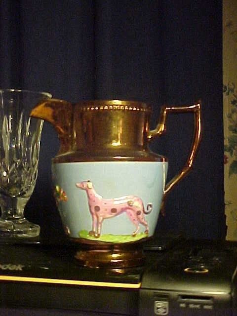 Title (ebay affiliate link): Antique Vintage 6" Copper Lustre Milk Pitcher w/ Fruit Basket Pink Steer & Dog