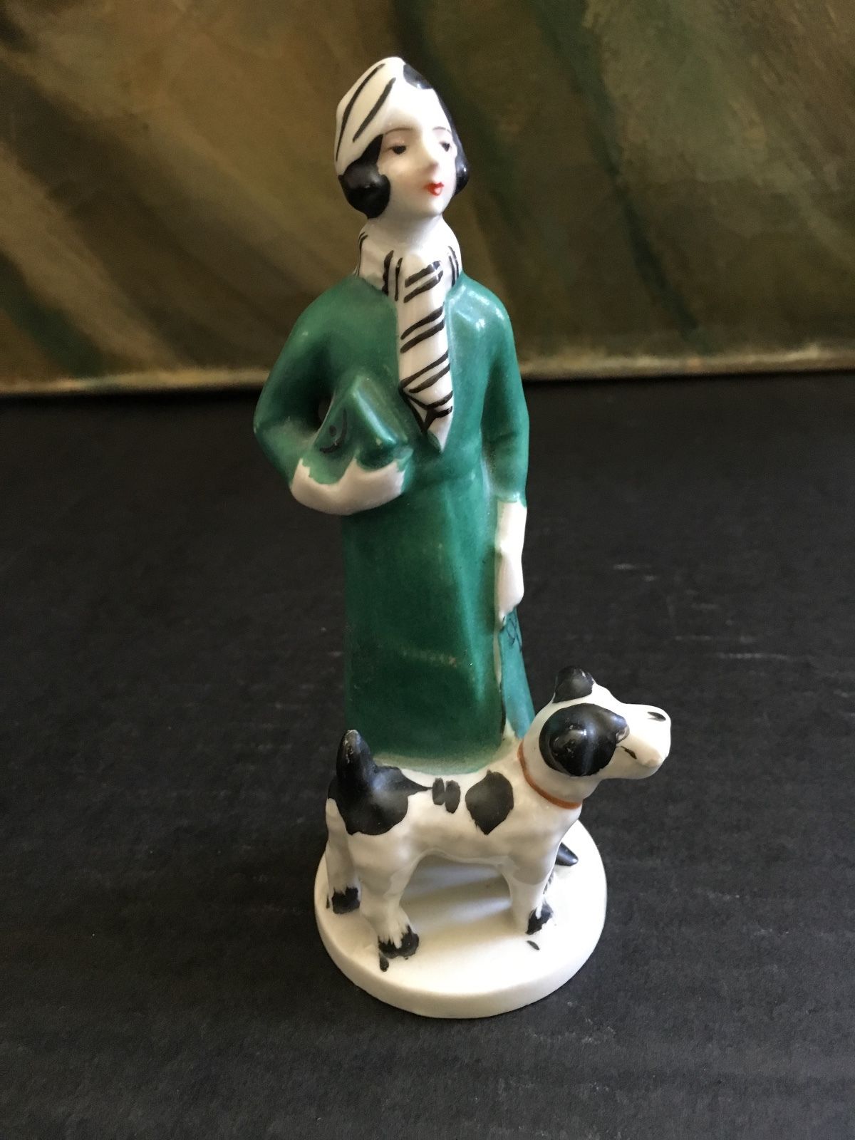 Title (ebay affiliate link): Art Deco 1920's Women Dress Hat with Cute Dog on Leash Bisque Figurine AR139