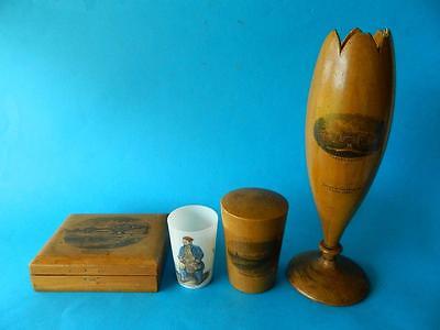 3 Mauchline Treen Wooden transfer ware Items Vase Box & Case with milk Glass