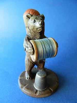 Black Forest Carved Bear Sewing Aid Reel Thimble & Needle Case Pincushion c1900s