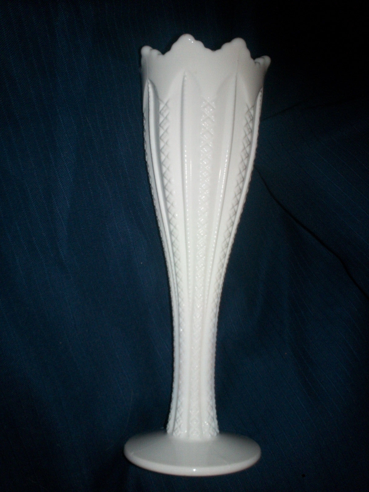 Title (ebay affiliate link): ORIGINAL DUNCAN MILLER ELEGANT MARDI GRAS WHITE MILK GLASS BUD VASE PRE-1955