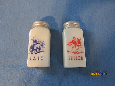 Advertising milk glass Salt a& Pepper shakers, Long & Corey, Garrettsville, Ohio