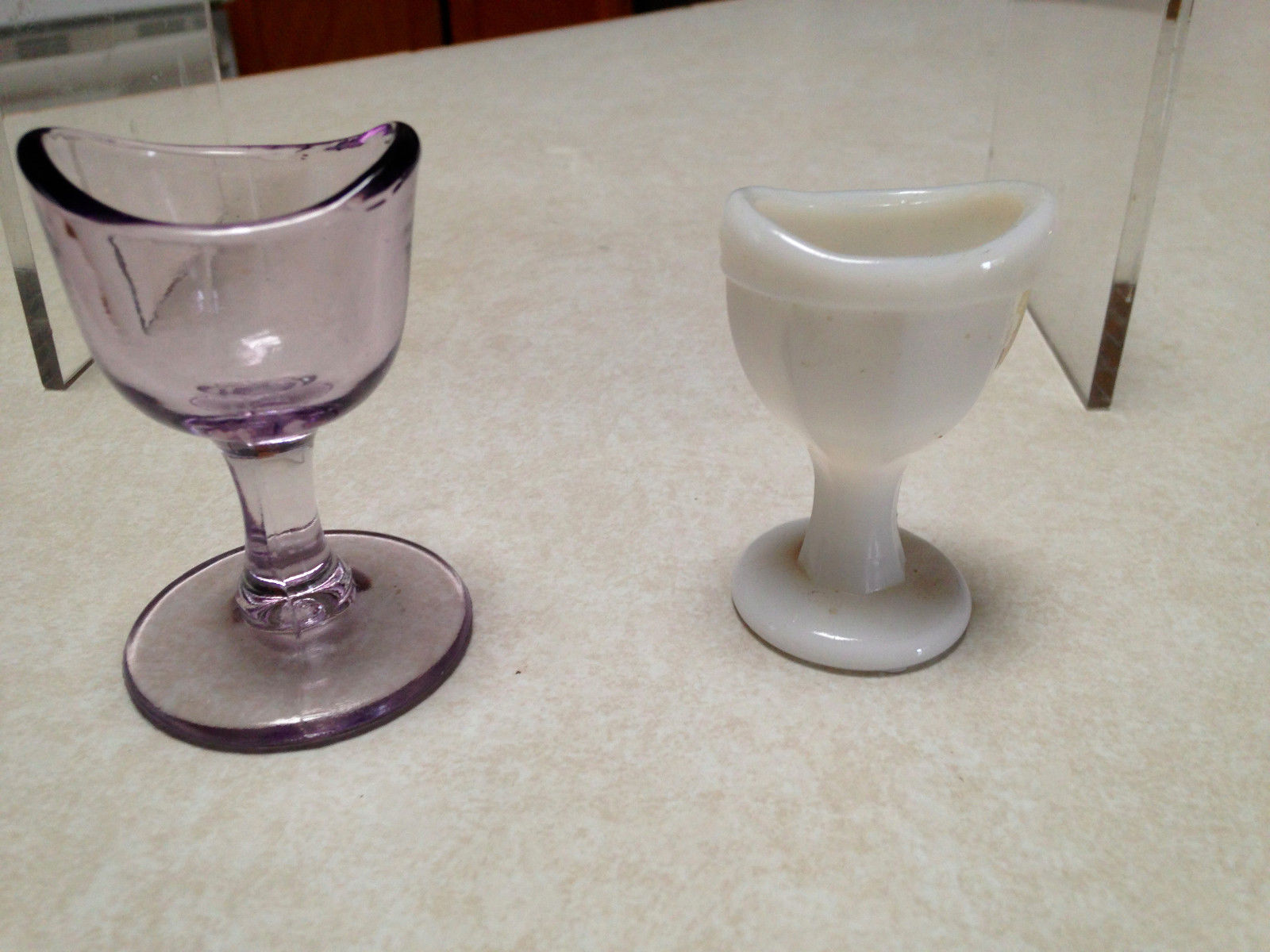 Title (ebay affiliate link): Pair of Eye wash cups - 1 Milk glass the other a pale lavender