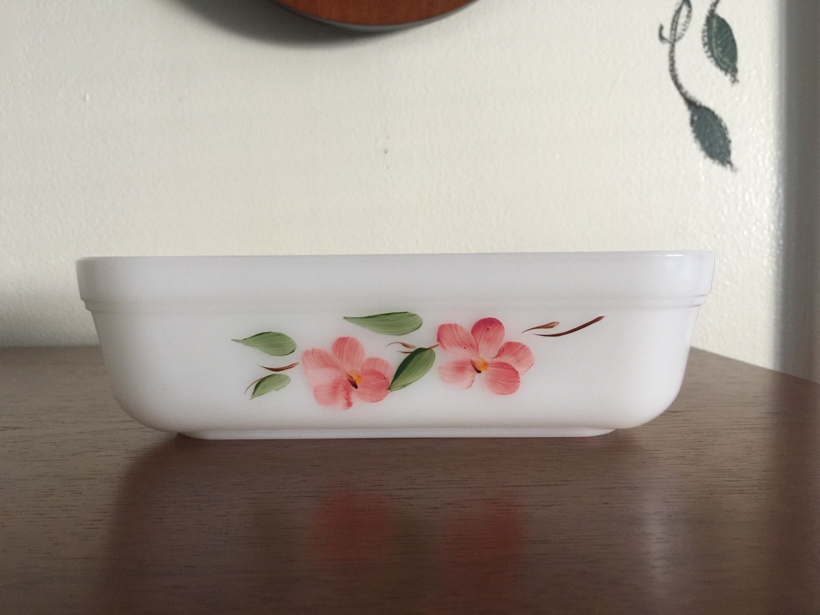 Fire-king milk glass baking oven ware dish casserole bread pan pink floral