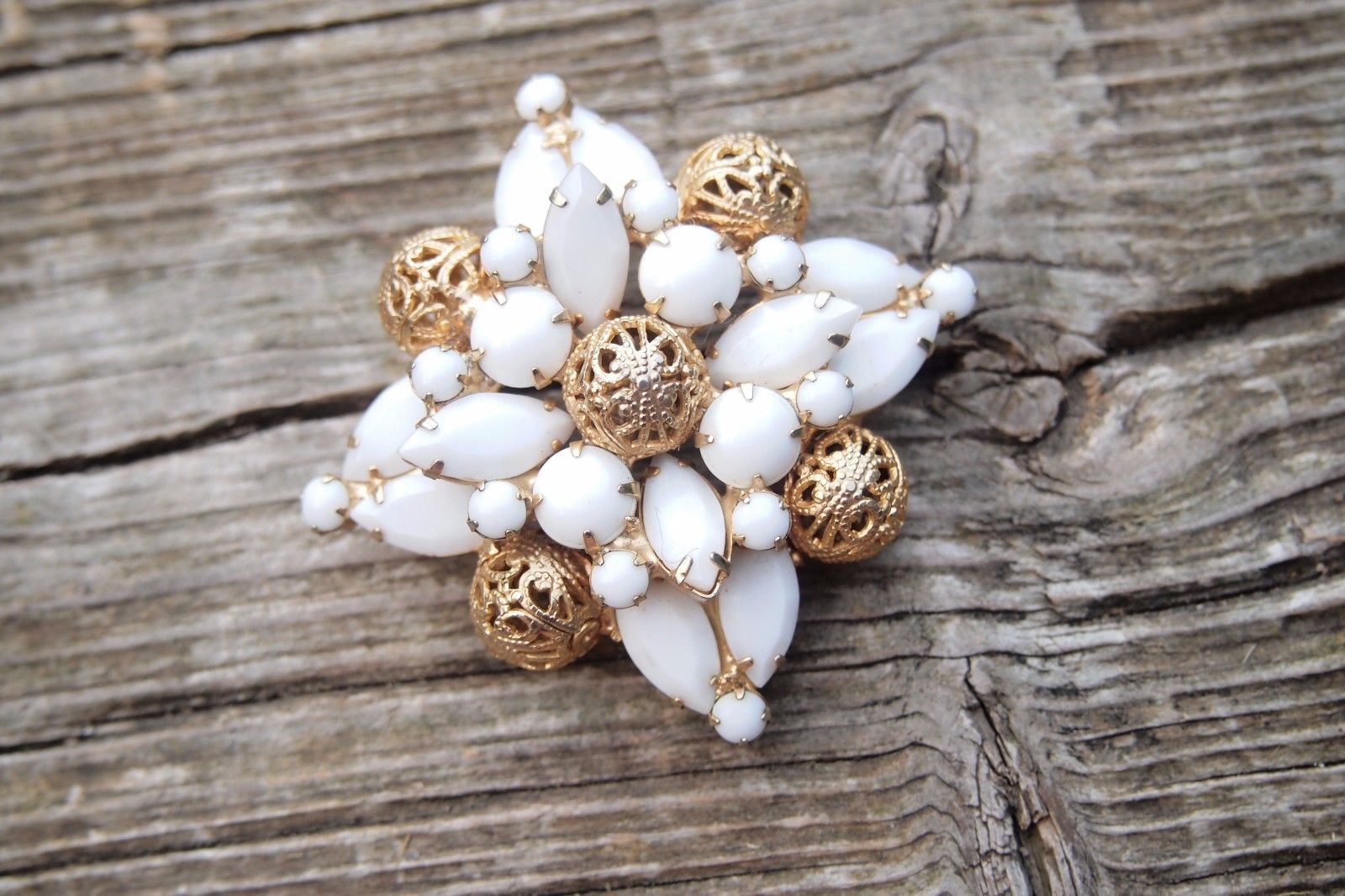 Title (ebay affiliate link): Vintage Juliana D&E Milk Glass Filigree Ball Accent Gold Plate Tiered Brooch Pin