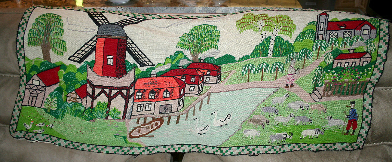 primitive ANTIQUE HAND HOOKED RUG 1930's intricate tiny NEEDLEPOINT farm house